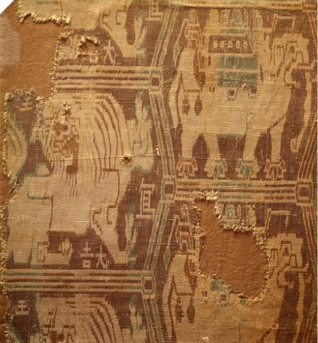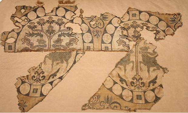 由于中亞匠人無法看到中國的織機,當?shù)厝司屠帽镜氐木曪@花織造體系對來自中國的平紋重組織進行仿制,產(chǎn)生了方向旋轉(zhuǎn)90度的平紋緯錦。后來進行技術(shù)提升,又織出斜紋緯錦。在烏茲別克斯坦蒙恰特佩墓地出土了一件褐色內(nèi)領貼,它的下端就拼縫有一塊斜紋緯錦殘片,這意味著在3-4世紀時,那里就已經(jīng)開始生產(chǎn)斜紋緯錦。