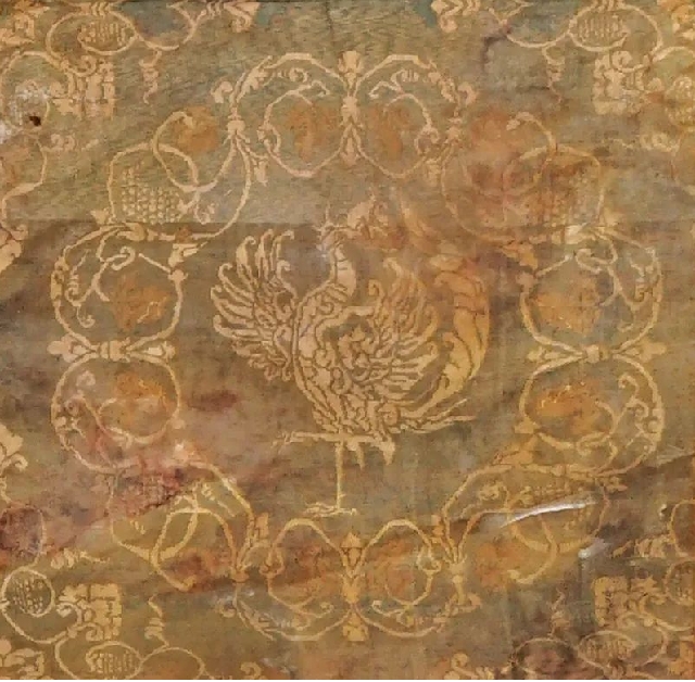 綠地纏枝葡萄團窠立鳳錦,天授二年(691)甘肅天祝慕容智墓出土