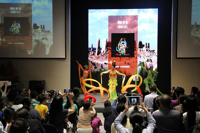 敦煌飛天作為莫高窟的名片,是敦煌藝術(shù)的標(biāo)志,只要看到優(yōu)美的飛天,人們就會想到敦煌莫高窟藝術(shù)。飄曳的衣裙、飛舞的彩帶,來自杭州歌劇舞劇院的舞蹈演員們伴著悠揚的曲調(diào),將敦煌壁畫中的飛天形象帶到了現(xiàn)場。