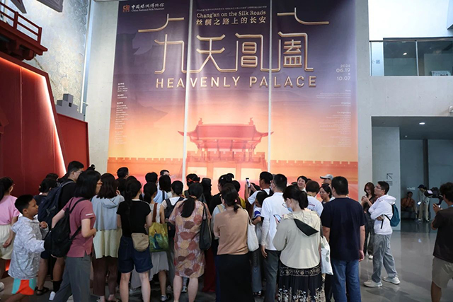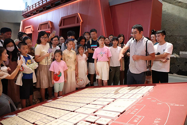 下午17:30,展覽策展團隊成員、浙江省博物館吳越國歷史文化研究展示中心魏祝挺副主任帶領著觀眾們在時裝館參觀“九天閶闔:絲綢之路上的長安”特展。