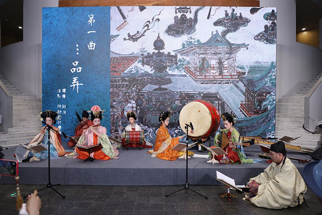 介紹壁畫磚雕中的琵琶、五弦、月琴、箏等樂器,演奏敦煌古譜中《品弄》《傾杯樂》《急曲子》等曲目,并演奏新曲《康娘子》《若夜蓮花開》等。