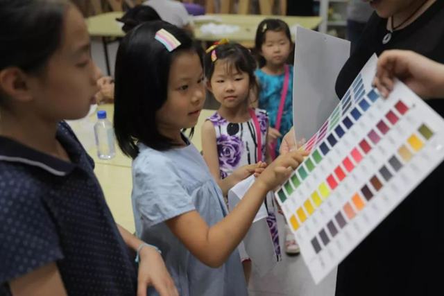 活動基于國絲館乾隆色譜復原研究成果,特別針對少年兒童策劃開展。在老師的指導下,小朋友們和爸爸媽媽一起學習槐米、蘇木、靛青三種天然染料的基礎知識和染色方法,一起合作完成三色絞纈絲巾。