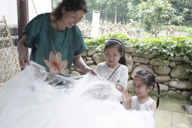 6月8日上午,國絲館桑廬熱鬧非凡,女紅傳習館鄉(xiāng)村基地——海寧云龍村的非遺傳承人和蠶農(nóng)為來館觀眾展示蠶桑非遺,表演傳統(tǒng)繅絲、剝綿兜、拉絲綿被、祭蠶神、唱馬鳴王、裹蠶訊粽、編蠶網(wǎng)等,觀眾們也紛紛參與體驗。