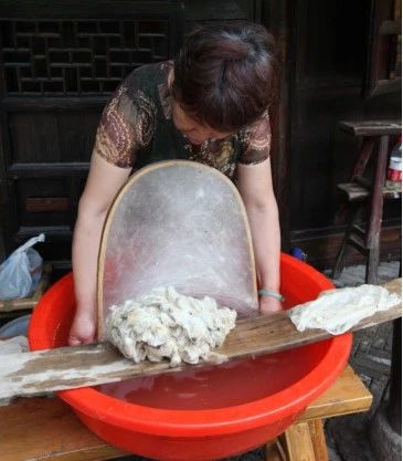 剝絲綿需要先將繭子用水浸透,在水桶中用手拉開后,除去蠶蛹將蠶繭套在手指上,再將剝好的繭子拉開套到一個半圓型的大竹弓上,累積后變成綿兜,可用于做絲綿被或絲綿襖等保暖用品。
