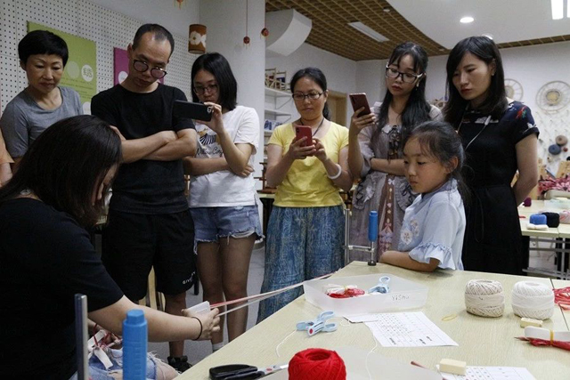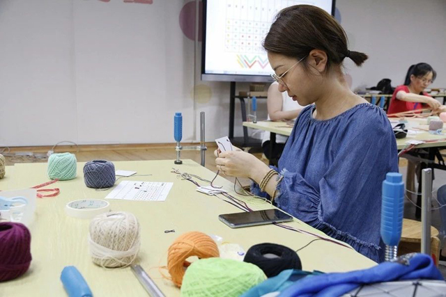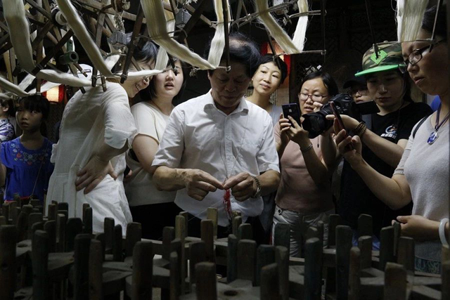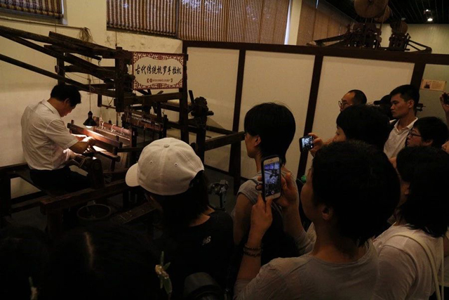 下午,國(guó)寶五星錦守護(hù)人龍博老師通過(guò)織物組織模型向?qū)W員介紹不同絲綢品種的工藝差別,然后在織造館通過(guò)織造工人現(xiàn)場(chǎng)演示“漢機(jī)織漢錦”和傳統(tǒng)杭羅織機(jī)工藝,讓學(xué)員探索傳統(tǒng)織機(jī)不同織機(jī)部件的作用,了解織造的奧秘。
