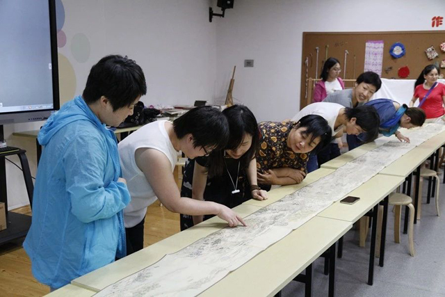 然后,眾人前往女紅傳習(xí)館學(xué)習(xí)體驗(yàn)綜板織工藝,了解經(jīng)緯交織的奧秘。研學(xué)策劃老師羅鐵家為大家講述了從蠶、蠶繭到蠶絲的變化過(guò)程,并推薦閱讀學(xué)習(xí)的相關(guān)書籍,其間還向大家展示了一幅長(zhǎng)達(dá)7米多的《姑蘇繁華圖》以供欣賞古人繪畫中的江南風(fēng)物。
