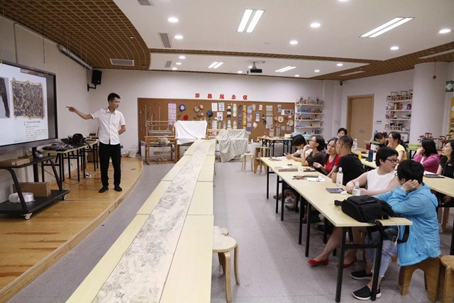 晚上,學(xué)員們通過(guò)聆聽(tīng)龍博老師的《老官山織機(jī)與五星錦復(fù)原》講座,了解成都老官山漢墓發(fā)掘經(jīng)過(guò)和國(guó)絲館“漢機(jī)織漢錦”團(tuán)隊(duì)復(fù)原“五星錦”的過(guò)程,學(xué)習(xí)漢代織機(jī)的織造原理。