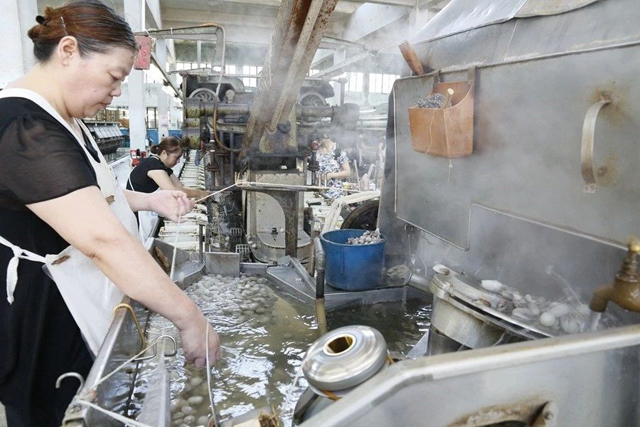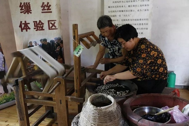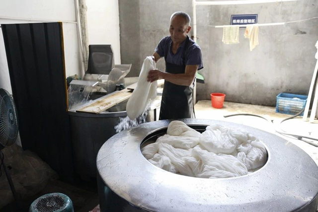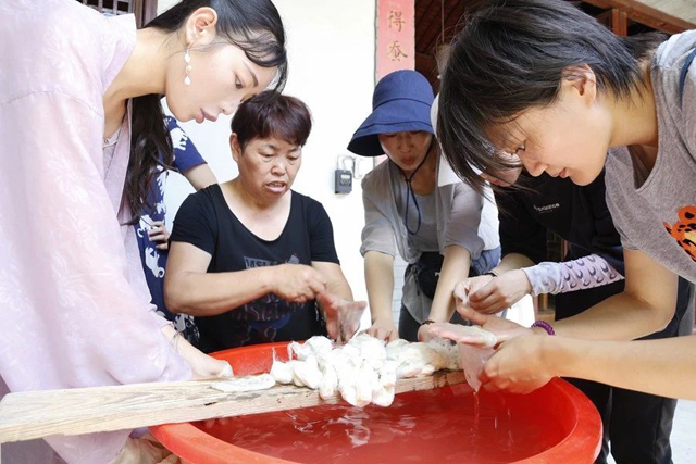 中午的行程點(diǎn)位于海寧云龍村。海寧云龍村有著悠久的蠶桑生產(chǎn)歷史,建國(guó)后更是作為浙江省重點(diǎn)蠶桑生產(chǎn)基地的蠶鄉(xiāng)。學(xué)員們一行參觀了蠶鄉(xiāng)記憶館,了解云龍輝煌的過(guò)去,在蠶俗文化園品嘗豐盛的蠶飯后體驗(yàn)傳統(tǒng)繅絲和剝絲綿工藝,并前往米賽公司在云龍村投資興建的現(xiàn)代機(jī)械化養(yǎng)蠶基地,探尋能給蠶鄉(xiāng)帶來(lái)蠶業(yè)生產(chǎn)變革的養(yǎng)蠶方式。