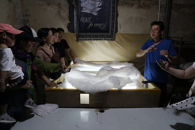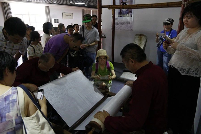 第三天中午的行程參觀點(diǎn)是湖州云鶴雙林綾絹有限公司,同時(shí)也是“中國(guó)蠶桑絲織技藝”子項(xiàng)目“雙林綾絹”的保護(hù)傳承單位。雙林綾絹傳承人鄭小華和工人們?yōu)榇蠹艺故緜鹘y(tǒng)綾絹織造工藝,特別是展示批床和石元寶踹石兩項(xiàng)工藝,讓學(xué)員明白如何讓綾絹的絲面平整密實(shí),光潔和突出花型。之后,大家學(xué)習(xí)了正在織花綾的小花樓織機(jī)的工藝原理,在生產(chǎn)車間的機(jī)器轟鳴中看到賈卡織機(jī)如何快速高效的織造出綾絹,以及在產(chǎn)品庫(kù)房查看花色繁多的綾絹產(chǎn)品,明白綾絹的書畫用途。