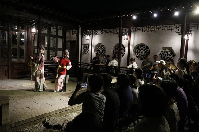 夜色漸深,避開人流的高峰,眾人來到“蘇州古典園林”之一的網(wǎng)師園,欣賞夏夜江南園林的亭臺樓閣、花草樹木,并觀看了昆曲、評彈、絲竹、古琴等非遺曲藝表演,從中體會園林雅致,品味古人情懷。