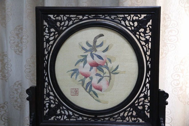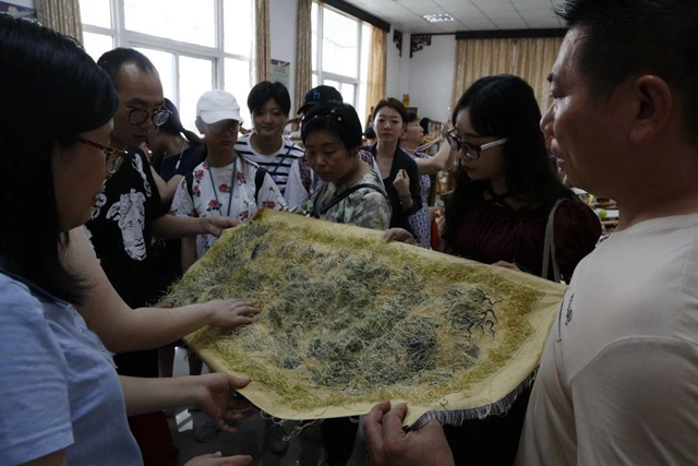 中午,學(xué)員們前往王嘉良緙絲世家工作室。該緙絲世家第六代傳承人王建江老師向?qū)W員們介紹了緙絲的織造工藝并展示了最近為故宮博物院制作的緙絲作品。雙面三異(異地、異色、異樣)作品讓學(xué)員們由衷贊嘆緙絲工藝之奇詭。