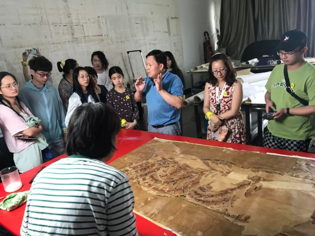 8月18日,經(jīng)過了大半日的奔波旅程,我們翻越天山,來到了吐魯番盆地。在講解員的帶領(lǐng)下,我們參觀了吐魯番博物館的“吐魯番通史陳列”“巨犀化石陳列”“吐魯番出土文書陳列”“吐魯番出土干尸及其隨葬衣物陳列”。團(tuán)員們驚奇于巨犀的化石,講解員告訴我們它是陸地上生存過最大的哺乳動(dòng)物,據(jù)考證還是世界上出土最完整的一具巨犀骨架化石。隨后,在汪自強(qiáng)主任的帶領(lǐng)下,我們進(jìn)入吐魯番博物館的修復(fù)室,看到了正在修復(fù)的伏羲女媧圖。伏羲女媧圖一般懸掛在墓室頂部,伏羲執(zhí)矩,女媧執(zhí)規(guī),他們是中國古代神話中人類的始祖。