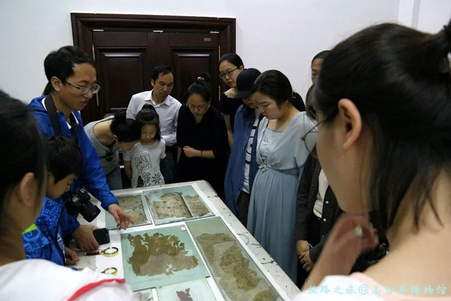 在高臺縣博物館由于該館的一些絲綢文物剛好在前段時間運到國絲館進行修復,因此可看的絲綢文物并不多。在高臺縣博物館李成康老師的帶領(lǐng)下,大家仔細觀察辨識絲綢文物的組織結(jié)構(gòu)和工藝,還發(fā)現(xiàn)一塊碎片中的一處針線,探討著不知是縫還是繡,其樂無窮。