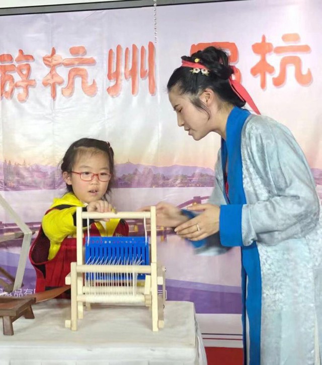 “千里迢迢來(lái)杭州,半為西湖半為綢?!弊怨藕贾菥团c絲綢有著千絲萬(wàn)縷的聯(lián)系,被人們稱為“絲綢之府”。身穿絲綢漢服的國(guó)絲館講解員鐘紅桑一出場(chǎng),就成為了活動(dòng)現(xiàn)場(chǎng)一道亮麗的風(fēng)景線。她通過(guò)標(biāo)本、圖片和小模型的展示,向市民朋友們介紹了中國(guó)絲綢起源的地位,蠶寶寶從卵到繭的生命過(guò)程,杭州本地所產(chǎn)的杭羅的生產(chǎn)工藝以及杭州著名的絲織企業(yè)——都錦生及其生產(chǎn)的像錦織物。