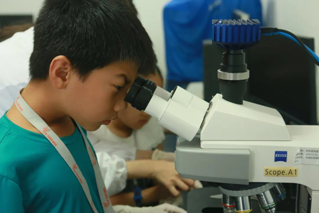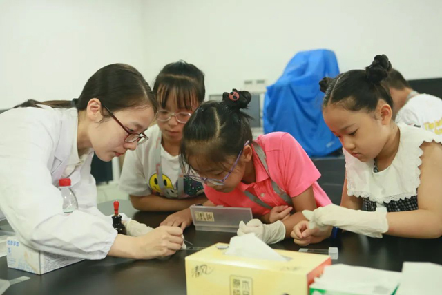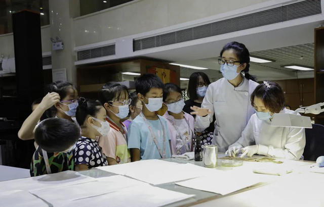 夏令營班還走進了國絲的“文物醫(yī)院”,在“文物醫(yī)生”的帶領(lǐng)下了解了文物修復(fù)背后的故事:每一件出土文物就像病人,在經(jīng)過檢測、制定治療方案、治療病害等過程中,從糟朽的狀態(tài)慢慢恢復(fù)到可以展出的樣貌。而另一個日常“密不示人”的空間——實驗室也在此次活動中向?qū)W員們開放~!這里是國絲科研工作的重要場所,在這里,大家分組觀察并討論,在“棉、麻、絲、毛”四種纖維的觀測中過了一把“小小科學(xué)家”癮~