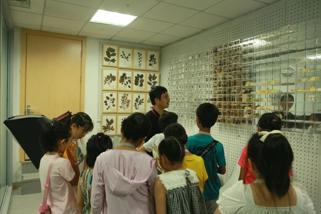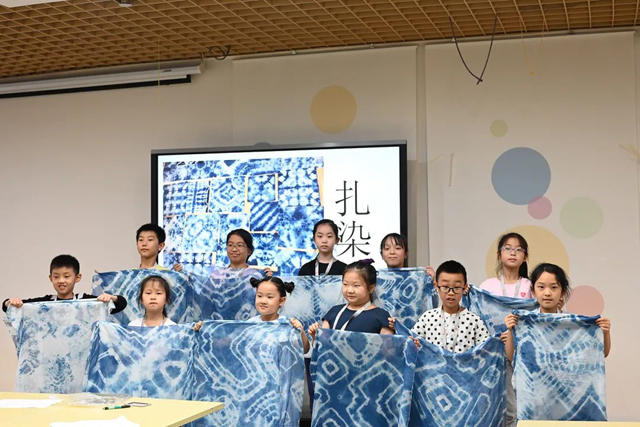 對天然染料和古代染色的了解和學(xué)習(xí)是本次夏令營的亮點之一。小營員們參觀了染草園,了解各種草木染料的最初樣貌;通過辨認染料標本的小組討論,學(xué)會認識和區(qū)分各類植物染料與所染色彩;國絲的染色專家老師還帶學(xué)員們走進了標本庫,向大家展示并生動地介紹了植物染色背后的歷史故事與科學(xué)故事;學(xué)員們還自己上手,學(xué)習(xí)了古代染色技術(shù),扎染并用天然染料,靛藍來為自己的作品染上美麗的藍色。