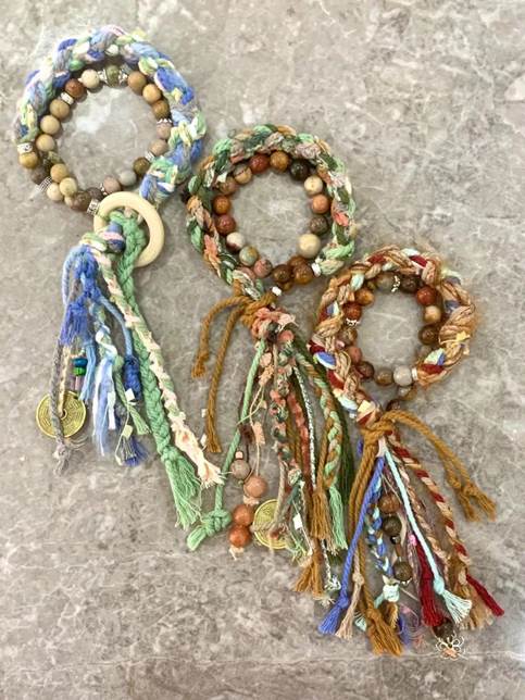 使用各色各種材料的棉線及珠子,進(jìn)行搭配和創(chuàng)意,編織蘊(yùn)含敦煌色彩美學(xué)的藏式手串。