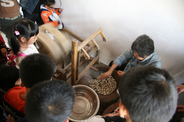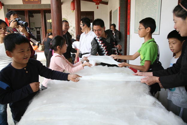 從踏上蠶鄉(xiāng)土地那一刻起,孩子們開始?xì)g叫起來。在云龍蠶俗文化園,帶著大家參觀的云龍村村委會徐家裕向小朋友們提出了許多問題,讓他們知道了蠶俗文化中的蠶神、蠶貓、蠶訊粽等知識,后來參與體驗(yàn)了傳統(tǒng)手工繅絲、剝絲綿、制作蠶絲被等動手項(xiàng)目。這些項(xiàng)目不僅難倒了小朋友同時也難倒了家長。不過小朋友們強(qiáng)烈的探索欲讓他們敢于一試身手。轉(zhuǎn)動土法繅絲的機(jī)器需要一個巧勁,有位小女孩無師自通轉(zhuǎn)動起繅絲機(jī)有模有樣,贏得一旁繅絲技藝傳承人和大家的稱贊。剝絲綿需要雙手配合,輕輕地在水中抖動,輕巧地張開繭衣翻轉(zhuǎn)套在指端。難,真的很難,小朋友們緊張地剝?nèi)≈Q繭,不停地相互交流和詢問一旁教他們剝絲綿的阿姨。在拉絲綿被環(huán)節(jié),輕巧的一個綿兜不僅需要力氣、巧勁還需要互相配合,力氣小了拉不動,沒有巧勁絲綿拉的不勻,合作雙方配合若沒有默契,更是拉不均勻??傊⒆觽凅w驗(yàn)到手藝之難之辛苦。