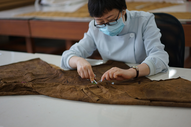 針對病害狀態(tài),對此批服飾采用以針線縫合為主的加固方式進行修復。即對破損部位采用局部襯墊或文物整體襯墊的方式,使用相應的針法將背襯織物與文物縫合。對于其中的烏紗帽,其修復方法有所不同。由于所用黑紗牢度下降較多,比較脆弱,所以選用透明度極高的真絲平紋織物縐絲紗覆于帽身表面,帽內則制作支撐模具,再將縐絲紗固定,以起到全面的保護。