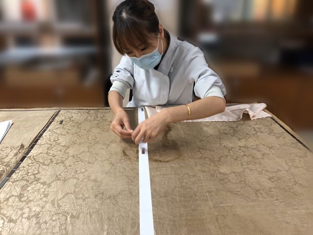 本年度完成圓領(lǐng)梅花紋羅夾衫、纏枝葡萄紋綾開(kāi)襠夾褲、編織鞋和絹襪等4件文物的修復(fù)。對(duì)于夾褲和絹襪,因破損較嚴(yán)重,故背襯織物采用全襯墊的方式;對(duì)于羅衫,因破損面積分布相對(duì)較小,只針對(duì)破損部位局部襯墊的方式添加背襯。修復(fù)完成后,編織鞋和絹襪均制合適的模具塞入其內(nèi)以起到支撐和緩沖作用。
