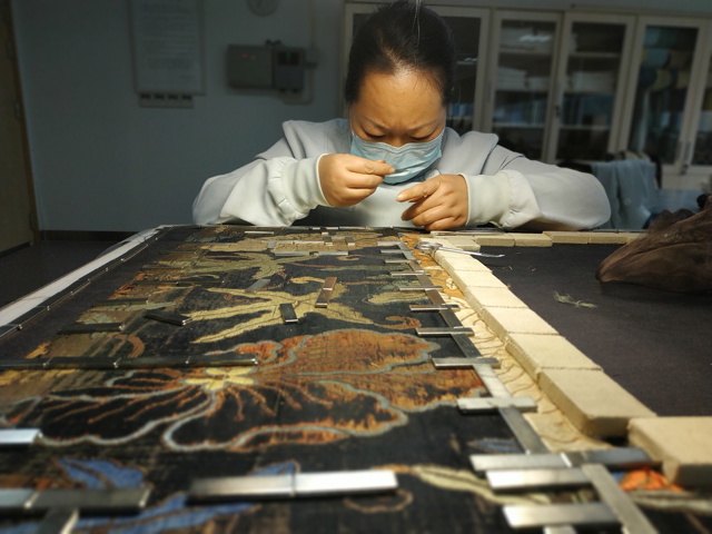 為便于針線縫合加固,將織錦緣邊與畫芯分離開單獨(dú)實(shí)施修復(fù)。裁剪與緣邊整體形狀相一致的背襯織物,襯于織錦下方,以針線縫合方式予以加固。而后,再將織錦緣邊與畫芯按原工藝拼合。該項(xiàng)目已2019年底完成。