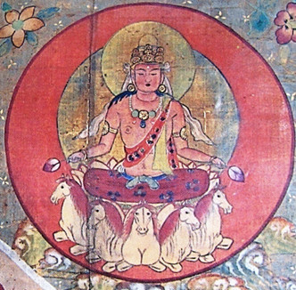 善無畏譯《尊勝佛頂真言修瑜伽》:“日天子并后。乘五馬車。兩手把開蓮華坐圓輪…門東面月天子并后。乘五鵝車。手執(zhí)風(fēng)幢上伏兔。坐白月輪中…”