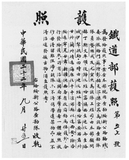圖4. 國(guó)民政府鐵道部頒發(fā)的綏新公路查勘隊(duì)護(hù)照