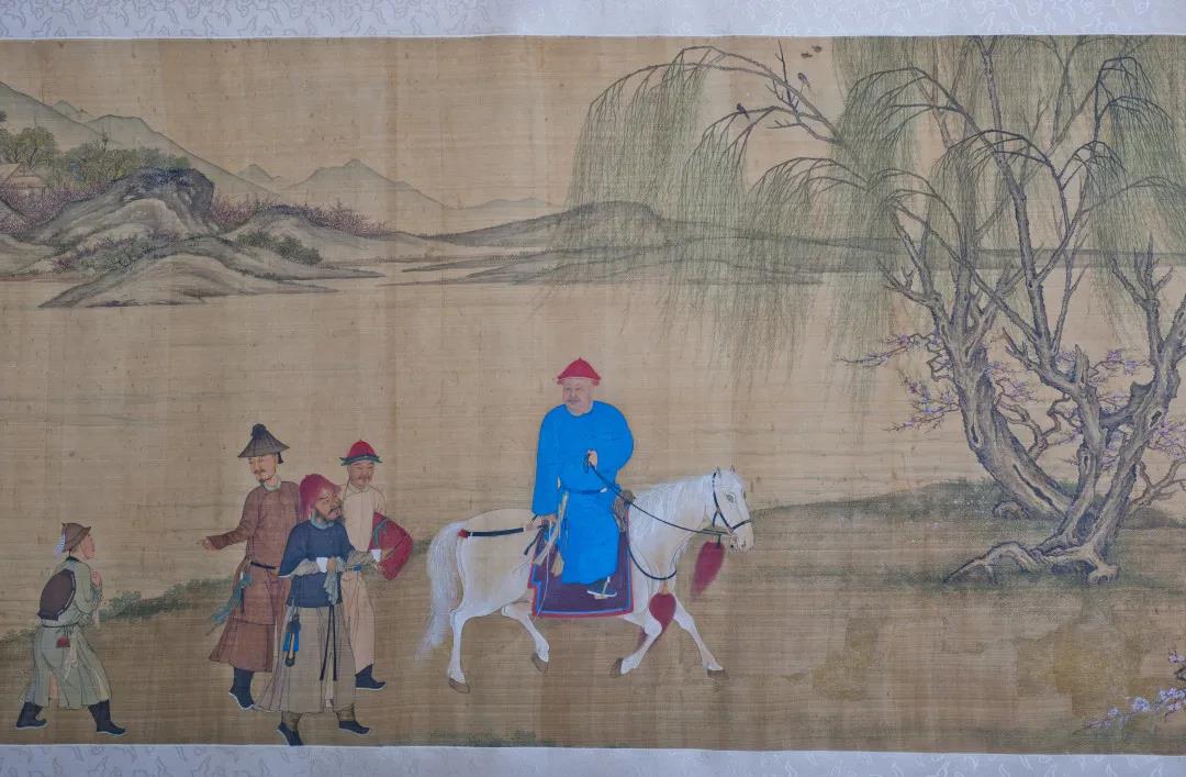 背峞在后世畫作中依然延續(xù)生命,或者也可以說它依然是生活用器。明代宮廷畫家商喜繪《明宣宗行樂圖》,是一幅刻畫精細(xì)的出獵場面,畫面上方,宣宗一騎在前,三名侍衛(wèi)緊隨其后,前方懷中抱箭而后顧者,即身負(fù)背壺(圖3)。青州博物館藏清佚名《李煦四季行樂圖》長卷,是既遵程式又見個性特征的一幀寫真圖,畫面依次為春夏秋冬。起首依時序自是春景,水邊綠柳紅桃,花外微露石橋一角。主人騎白馬,戴緯帽,一襲藍(lán)袍,帶系解食刀。徒步相從者各系佩帉,即所謂“荷包手巾”,中有挾茵褥者一,持煙桿者一,末一人腰間拴著火鐮,右肩貼身背一個穿帶扁壺(圖4)。這一細(xì)節(jié)似乎不是空無依傍,只是負(fù)壺的方式與此前稍有不同。