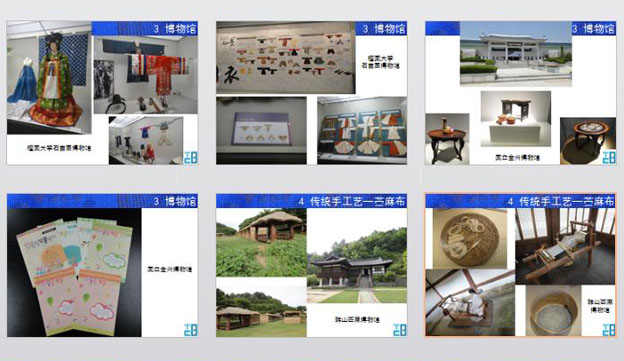 首先是介紹了行程,在首爾看了一些有傳統(tǒng)工藝的博物館,在公州看了博物館、手工村等,在扶馀是此行重要目的地,是基于博物館跟韓國傳統(tǒng)文化大學的合作項目。另外還去了韓山的苧麻工藝、去全州看了一個工藝市場,最南面去看了一個藍染工場。
