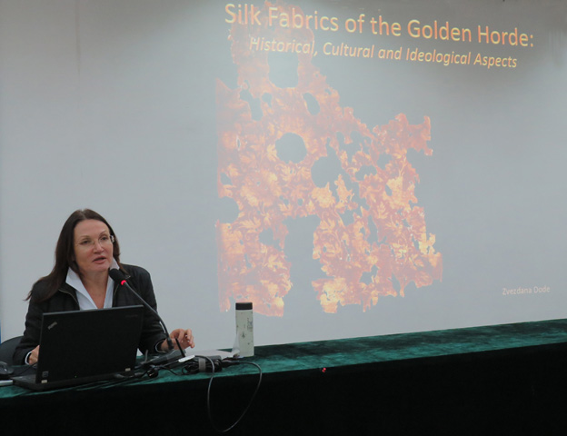 Zvezdana Dode博士現(xiàn)在的主要研究方向是中世紀(jì)的服裝研究,對(duì)象為中亞和北高加索山脈等地區(qū)的出土文物。本次講座她講述了她對(duì)上世紀(jì)和本世紀(jì)初在古金帳汗國(guó)的領(lǐng)土上的出土文物的研究發(fā)現(xiàn),墓葬考古點(diǎn)在北高加索山和伏爾加河流域。講座從經(jīng)濟(jì)發(fā)展、貿(mào)易聯(lián)系、外交關(guān)系、社會(huì)結(jié)構(gòu)等多方面的線索來(lái)研究紡織品,詳細(xì)論述了數(shù)件文物上十分具有時(shí)代特色的紋樣,并進(jìn)行了區(qū)域橫向和時(shí)間縱向的對(duì)比。此外,還著重探討了幾種裝飾藝術(shù)紋樣的藝術(shù)史源和所反映的歷史環(huán)境。
