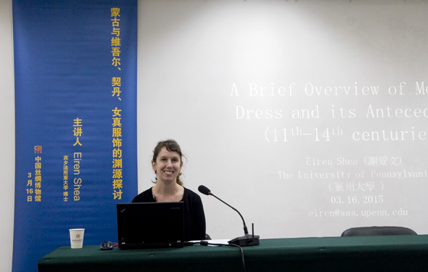 3月16日下午,來(lái)自美國(guó)賓州大學(xué)的博士生謝愛(ài)文(Eiren Shea),作為中國(guó)絲綢博物館的訪問(wèn)學(xué)者,在我館活動(dòng)報(bào)告廳舉行了一場(chǎng)“蒙古與維吾爾、契丹、女真服飾的淵源探討”的講座。