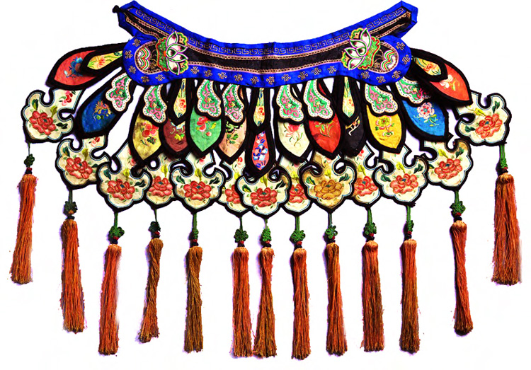 云肩的裝飾刺繡手法有片繡、珠繡、盤金、串珠、平針與打籽繡等多種技巧,而使云肩像云、像彩虹、像四季花壇而充滿聲色情調(diào),據(jù)載慈禧太后的云肩就由3500顆珍珠串連而成,通體云霞燦爛。