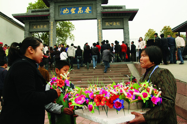 所謂的軋蠶花,就是蠶農(nóng)們?yōu)榱似砬箫L(fēng)調(diào)雨順、蠶桑豐收而舉行的一項(xiàng)古老的蠶事風(fēng)俗活動(dòng)。早先蠶農(nóng)養(yǎng)蠶時(shí)留繭育種,為了確保自家蠶種出得好、出得齊,每當(dāng)清明時(shí)節(jié),含山方圓百里的百姓都要背著蠶種包,頭插蠶花,蟻擁含山,去蠶神廟祭拜蠶花娘娘,為他們的蠶寶寶祈求消災(zāi)祛病,祝愿蠶花豐收。年復(fù)一年,千年沿襲,就形成了含山獨(dú)有的民俗文化活動(dòng)——清明軋蠶花廟會(huì)。