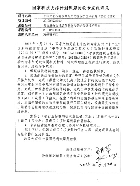 2016年06月26日,2012年11月24日,國(guó)家文物局科技司在北京組織召開了國(guó)家科技支撐計(jì)劃“中華文明探源及其相關(guān)文物保護(hù)技術(shù)研究”項(xiàng)目“考古發(fā)掘現(xiàn)場(chǎng)遺存鑒別與保護(hù)關(guān)鍵技術(shù)研究”課題驗(yàn)收會(huì)議。該課題承擔(dān)單位為敦煌研究院,參加單位為長(zhǎng)安大學(xué)、中國(guó)絲綢博物館、中國(guó)科學(xué)院上海光學(xué)精密機(jī)械研究所、浙江大學(xué)、陜西考古研究院,我館的課題成員周旸和鄭海玲參加了此次會(huì)議。