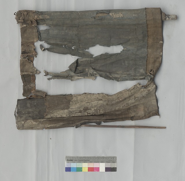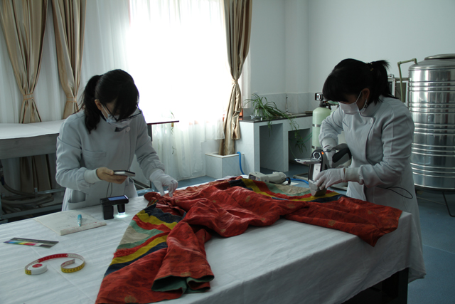 項(xiàng)目通過(guò)無(wú)損檢測(cè)方法對(duì)紡織品進(jìn)行信息提取,通過(guò)現(xiàn)場(chǎng)調(diào)查對(duì)文物進(jìn)行整體病害評(píng)估。在全面了解典型病害和保存現(xiàn)狀的基礎(chǔ)上,結(jié)合對(duì)組織結(jié)構(gòu)、纖維、金屬線(xiàn)和染料等的檢測(cè)分析結(jié)果,確定保護(hù)修復(fù)技術(shù)路線(xiàn)。采取低氧消毒、局部清洗、定制修復(fù)材料及針線(xiàn)縫合加固的物理方法和托裱法對(duì)9件紡織品實(shí)施了保護(hù)修復(fù)。使其在強(qiáng)度和柔韌度上得到改善,典型病害得到有效治理。