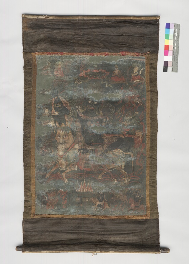 西藏博物館藏明清絲綢文物保護(hù)修復(fù)項(xiàng)目涉及絲綢文物5件,分別為墊料、枕套、帷幔、法衣、跳神褲各1;西藏博物館藏唐卡保護(hù)修復(fù)項(xiàng)目涉及唐卡4件,分別為布畫(huà)白度母唐卡2件、布畫(huà)上師供奉唐卡1件及考古出土的布畫(huà)唐卡1件。2013年5月,中國(guó)絲綢博物館接受西藏博物館的委托后,于同年11月赴拉薩進(jìn)行文物信息采集。2014年4月,方案經(jīng)國(guó)家文物局批復(fù)。次年,文物運(yùn)抵杭州,陸續(xù)開(kāi)始實(shí)施修復(fù)。修復(fù)完成后,此兩項(xiàng)目于2017年9月4日通過(guò)初驗(yàn)。