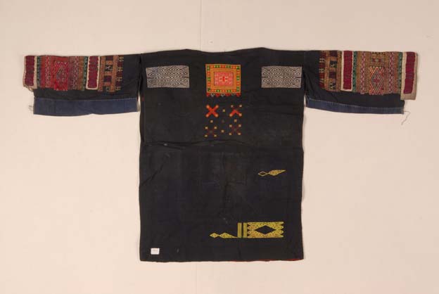 正面:背面:尺寸:衣長:73 領(lǐng)口30.5: 袖口:21袖長: 40 下擺寬:58 (厘米)描述: 貫首服是中國歷史上最原始的服裝。該貫首服前襟齊腹,后襟至臀。前后衣片為挑花紋樣,衣袖則是戳紗繡。挑花繡又稱十字挑花,是民間廣泛應(yīng)用的一種傳統(tǒng)刺繡工藝,在織物經(jīng)緯線的相交處運針;戳紗繡又稱納錦,繡線平行于經(jīng)線與緯線。苗繡不同于湘繡、蜀繡、蘇繡,它以其濃厚的民族風(fēng)格、夸張的構(gòu)圖、獨特的技藝和豐富的色彩而稱著于世。