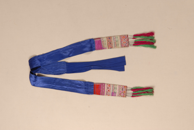 描述:此條為布依族人使用的腰帶,呈狹長(zhǎng)形,主要面料為藍(lán)色素緞,兩頭以幾何紋條形織錦裝飾,并以紅、綠兩色絲線作穗子裝飾。