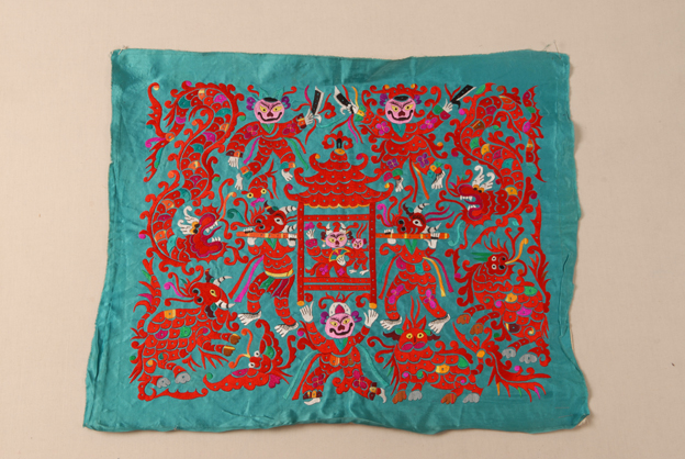 描述:此件壁掛來(lái)自貴州臺(tái)江縣施洞鎮(zhèn),是當(dāng)?shù)孛缱迦嗣竦淖髌?。壁掛以亮藍(lán)色作底色,其上以大紅作主色調(diào),并配以黃、綠、黑、白等色,表現(xiàn)了一幅“老鼠提親”的場(chǎng)景,用色對(duì)比強(qiáng)烈。