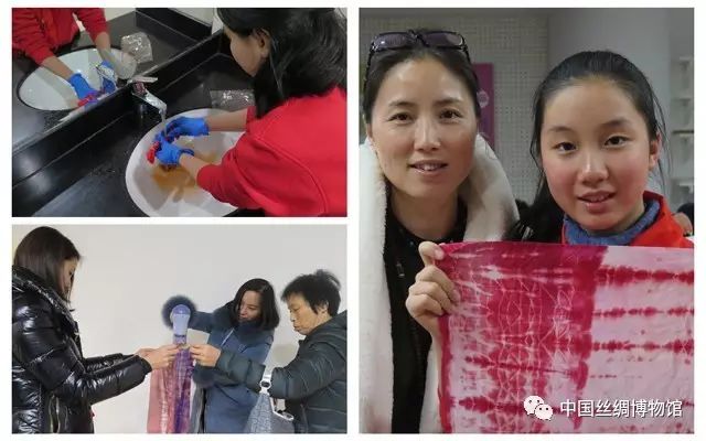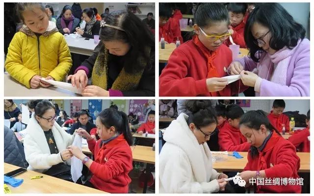首先需要將裱糊燈彩的絲綢面料進行扎染。學(xué)員們根據(jù)老師的示范,將絲綢折疊成扇形,然后再用繩子將折疊后的絲綢捆綁起來,柔軟的絲綢不聽話,要完成這一步驟并不容易。不過好在學(xué)員們都有家庭成員作幫手,互相合作可以共同完成。