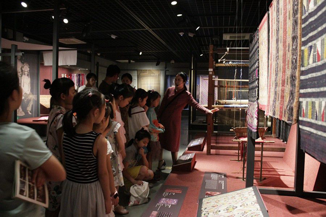 炎炎日正午,灼灼火俱燃。這樣的夏日炎熱都比不上小小編織家的熱情,他們準時赴約中國絲綢博物館,先是跟隨講解員在展廳學習不同民族的織物文化和不同織機的工作原理。