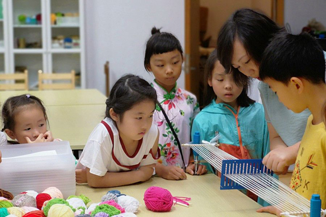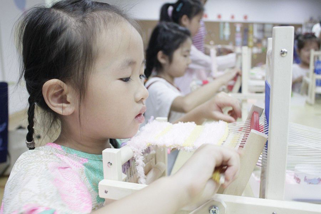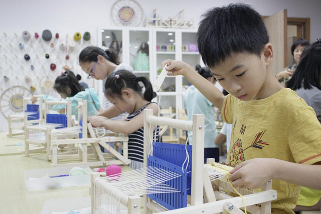 織造時間開始,小朋友們經(jīng)過作品構(gòu)思、選取材料之后,老師教授了如何8字繞梭,如何提綜、開口、引緯、打緯??椩斓纳衩孛婕啽唤议_了,他們便盡情地享受著下午的織造時間。聰明的同學還把不小心織錯的地方處理成藝術(shù)細節(jié),學習速度之快令老師和家長都感到驚訝。