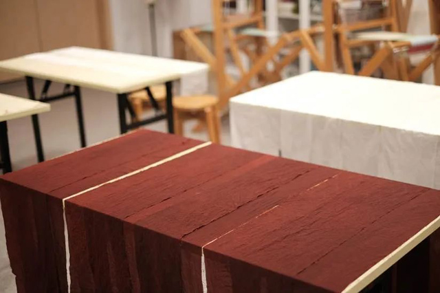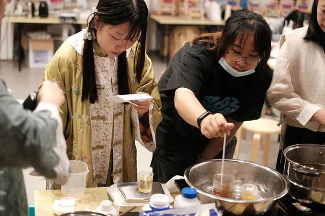 回到傳習(xí)館,學(xué)員們復(fù)原絞纈絹衣也進(jìn)入了收尾階段,大家又對明天課程要復(fù)原的第二件文物“小花紋綺袍”所用布料進(jìn)行了上漿。