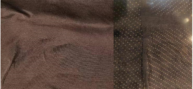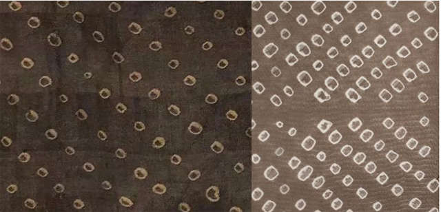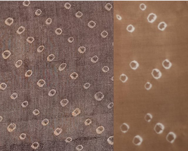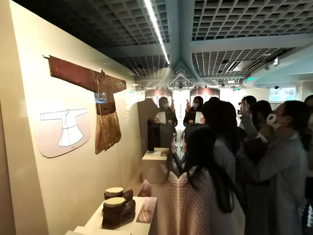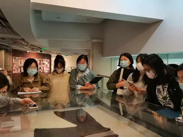 下午,研習(xí)班的學(xué)員們在老師的帶領(lǐng)下一同前往修復(fù)館,對照“漢魏印象:漢晉南北朝服飾藝術(shù)展”的文物“絞纈絹衣”進(jìn)行講解。在參觀過程中發(fā)現(xiàn)了兩處令人驚喜的地方:一是老師將最終染色方案染出的布樣與文物進(jìn)行對照,顏色基本接近;二是學(xué)員們在老師的指點下,尋找不同形態(tài)的絞纈圖案,大家還找到了和自己所復(fù)原的最為相近的小點,成就感滿滿。