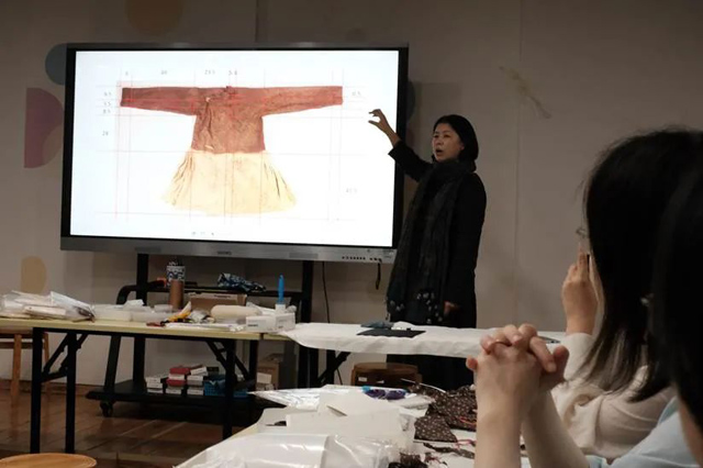 下午,課程開啟了B款“小花紋綺襖”的復原研究。老師就文物的形制、款式、縫制工藝等方面進行了詳細講解,并與A款對比,分析兩者之間工藝上存在的差異。