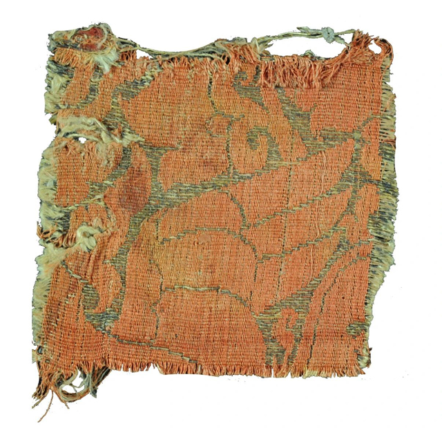 該織金錦殘片圖案不完整,有部分花蕾,還能辨認(rèn)出一個(gè)展開(kāi)的翅膀和半條鳳尾,可以判斷為鳳穿花卉一類(lèi)的圖案。平紋地上以平紋固結(jié)組織顯花,屬納石失一類(lèi)。