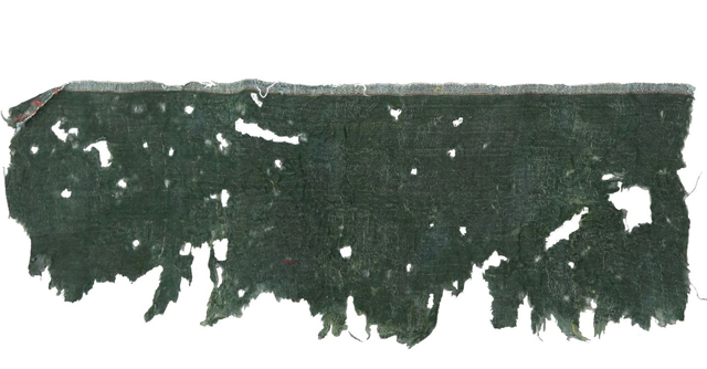墨綠色正反五枚緞殘片,經(jīng)線為墨綠色,緯線為深灰綠色。圖案為如意云紋,經(jīng)向循環(huán)為24.5cm。該織物由靛青和槐米套染。