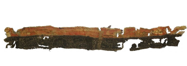 該織金錦由黑色和紅色兩塊織金錦縫合而成的長(zhǎng)方形織物,正面磨損嚴(yán)重,很可能曾用作領(lǐng)緣。一塊為黑地,用捻金線織出菱格地上纏枝牡丹的紋樣;另一塊為紅地鷹紋織金錦,同樣的織錦在美國(guó)克利夫蘭藝術(shù)博物館也有收藏。