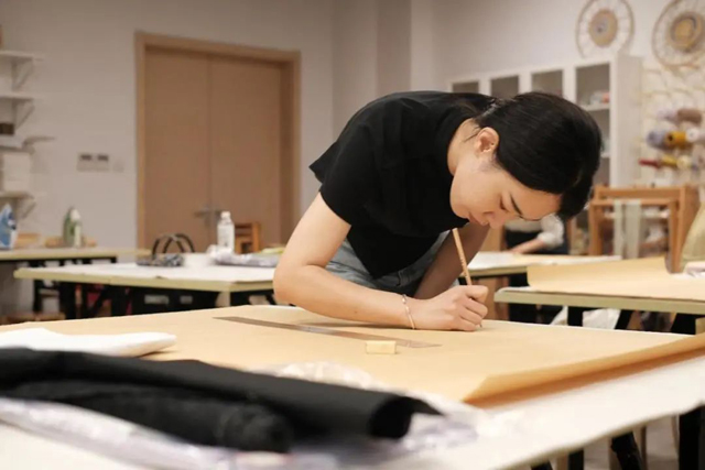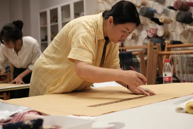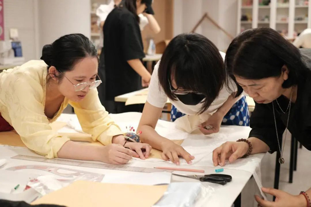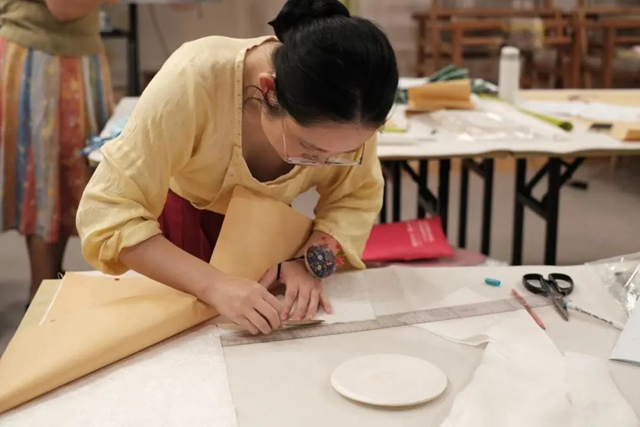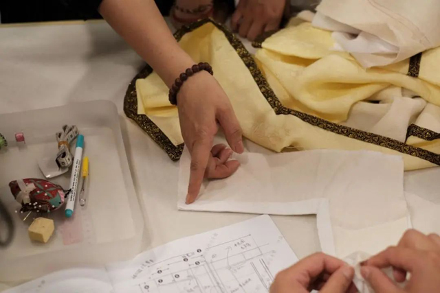 中午,大多學(xué)員沒有休息,或在研討,或在制版,課程還未開始,學(xué)員們已經(jīng)迫不及待地圍繞樣衣開始了自主研究。很多對(duì)宋代對(duì)襟服飾有制作經(jīng)驗(yàn)的學(xué)員,對(duì)鑲邊夾衣的穿插排料也有些意料之外,不禁驚嘆古人的智慧。