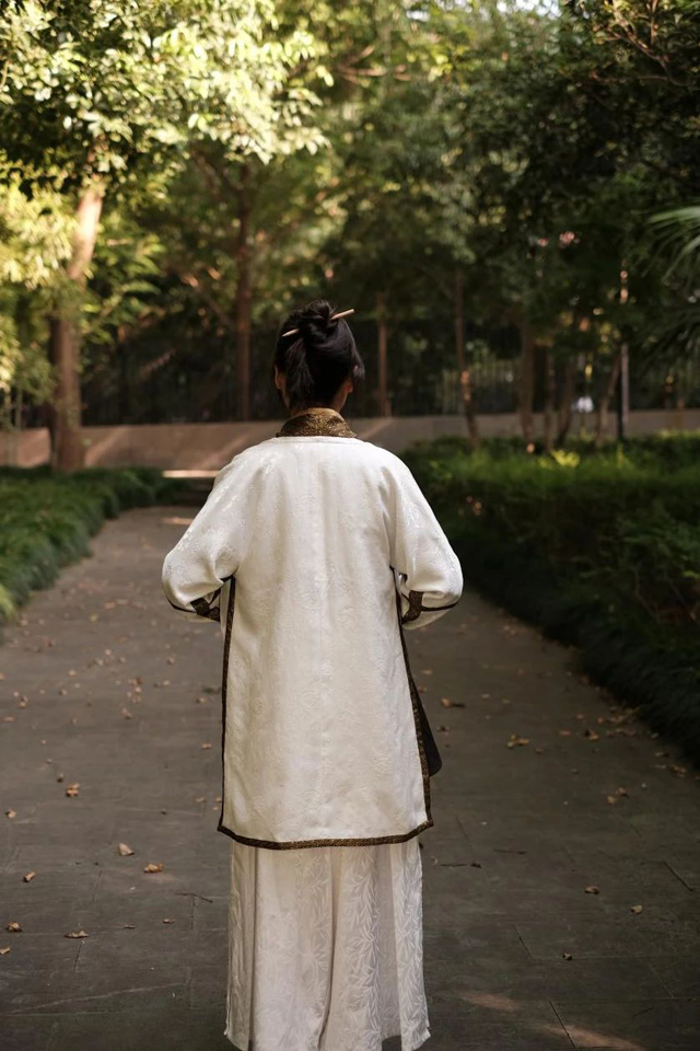 又到了收工的時候,叮咚,助理小模特上線了!一身南宋裝束,在即將閉館之際,落日余暉之中,走在國絲的清幽小徑,享受片刻的休閑時光。